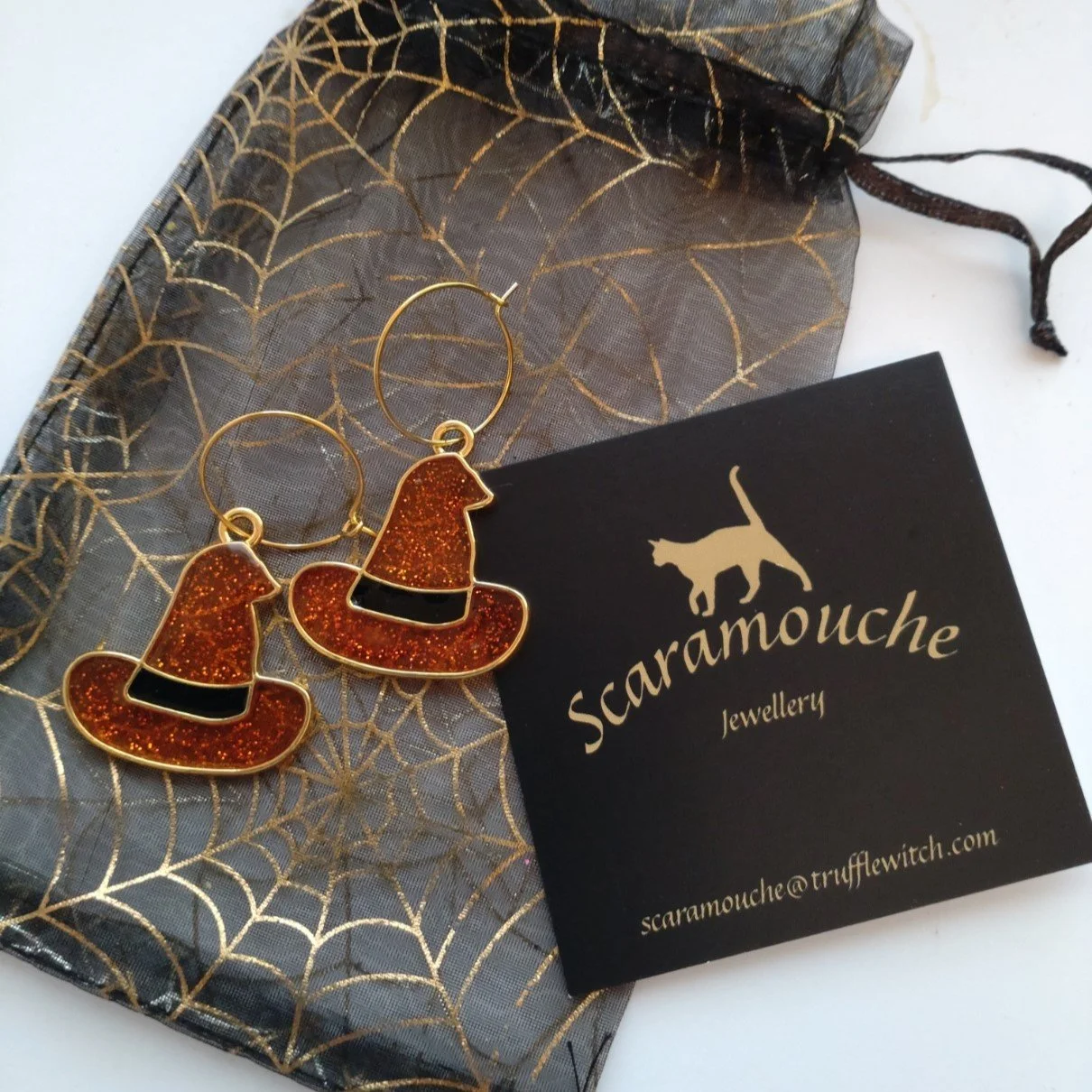 Scaramouch Jewellery Categories: All Halloween Bracelets Pendants Earrings Witch Hat Glitter Earrings £4.50 Witch Hat Glitter Pendant £4.50