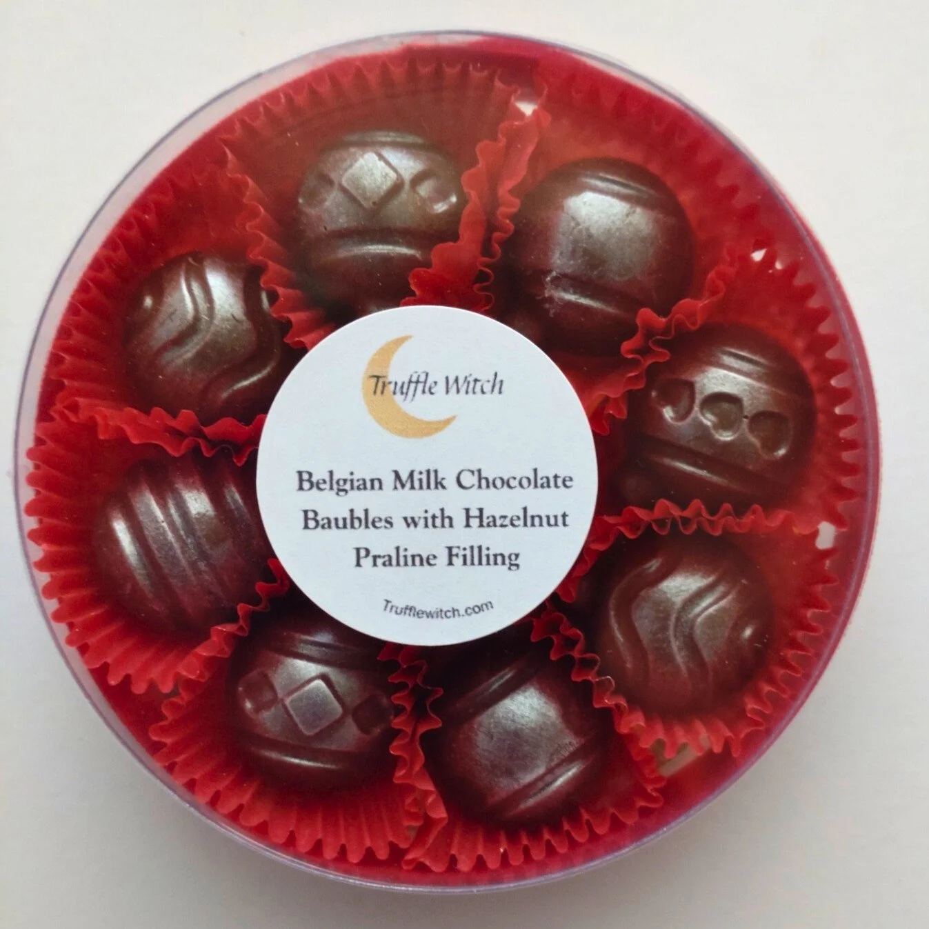 A luxurious seasonal treat, this elegant gold box (with clear lid and ribbon) holds a beautifully curated selection of handcrafted chocolates. Inside, you’ll find six bauble-shaped chocolates made from smooth 55% Belgian dark chocolate, dusted with lustre and filled with a rich, nutty almond praline.
